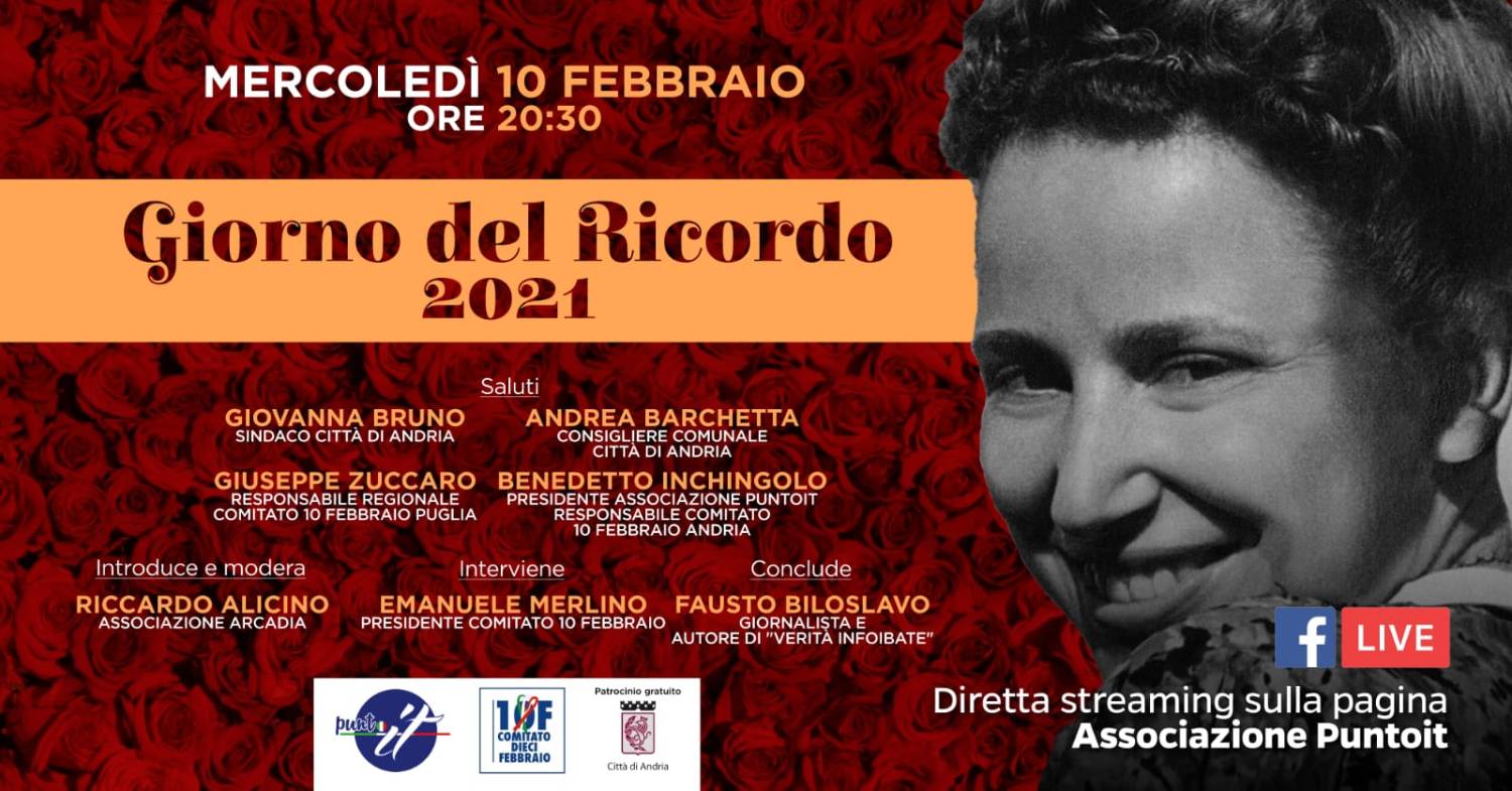 In serata, poi, l’approfondimento in diretta Facebook sulla pagina dell’ass. Punto It. Un incontro in cui sono intervenuti il Sindaco di Andria Giovanna Bruno, il Consigliere Comunale di FdI Andrea Barchetta, il responsabile regionale del Comitato 10 Febbraio della Puglia Giuseppe Zuccaro e il responsabile andriese del Comitato 10 Febbraio Benedetto Inchingolo. Saluti e interventi che hanno preceduto le testimonianze dei due ospiti d’eccezione della serata: il presidente nazionale del Comitato 10 Febbraio Emanuele Merlino (autore dei libri “Foiba Rossa” e “Norma Cossetto, storia di un’italiana”) e il noto giornalista Fausto Biloslavo, figlio di un esule e nipote di un infoibato, autore del libro “Verità Infoibate, le vittime, i carnefici, i silenzi della politica”. A moderare l’incontro Riccardo Alicino dell’Associazione Arcadia. Un viaggio nel passato che ha attraversato l’attualità, per una pagina di storia della nostra Italia da non poter ignorare.